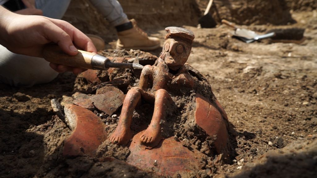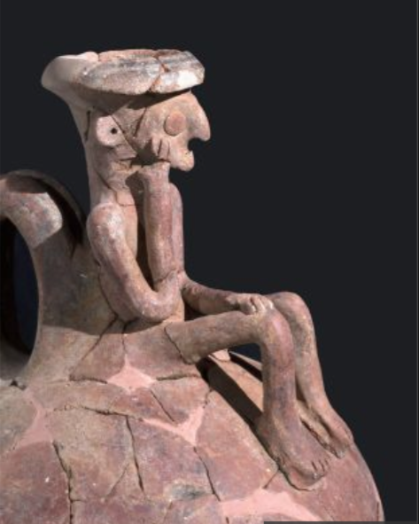 It caps an 18-cm (7″) jug, and was found in a grave alongside other funerary offerings including daggers, arrowheads and an axe head. “Such a unique ceramic vessel, which is the first we’ve found, within the context of the grave, can indicate that an important person was buried there,” Gilad Itach, IAA excavation director, told AFP.