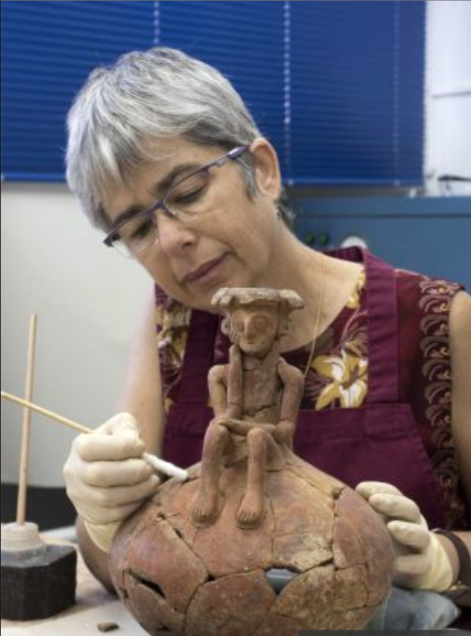 Unique statue on jar from 3800 years ago uncovered in Yehud: Restoring the pottery at the IAA laboratory. Klara Amit, IAA