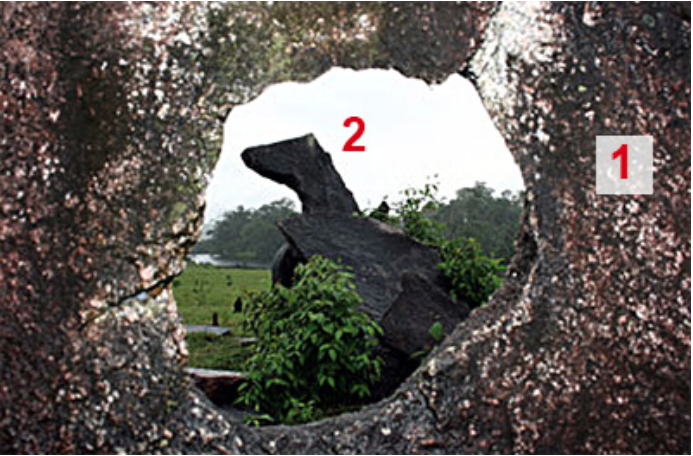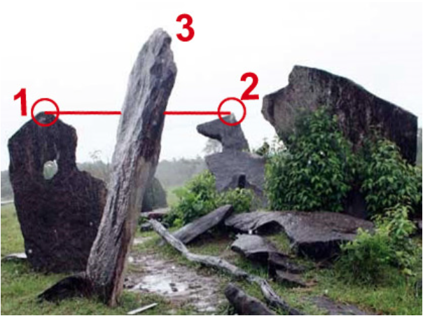 One of the rocks in the area of almost circular shape is a sheet of granite 3m (10ft) high, with an opening in the center with about 30cm (a foot) in diameter, called “Hole Stone” (1).There is another stone aligned in relation to this (2) and demarcating the exact sunrise on the December solstice. Another board shaped rock – which measures 2.5 m (8ft) in height (3) is on a slope such that during the December solstice, the apparent movement of the sun seems to “walk” according to the slope of the rock, as if it “draws the way.” Thus, the projected shadow has the same thickness of the rock and points to the east, while the sun goes down in the west. At other times of the year, the rock shows that the sun is further north, since the sun is at its southernmost position. We can see the perfect alignment between Rock 1 with Rock 2 by sighting through the hole.