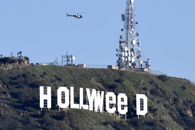 He and his partner Sarah Fern conducted research on the sign to determine how to scale the structure and place tarps over the 45-foot-tall o’s to turn them into e’s, Fernandez told the online magazine Vice. They aimed to prompt a conversation about cannabis after California voters approved a measure to legalize recreational marijuana in November, he said.
