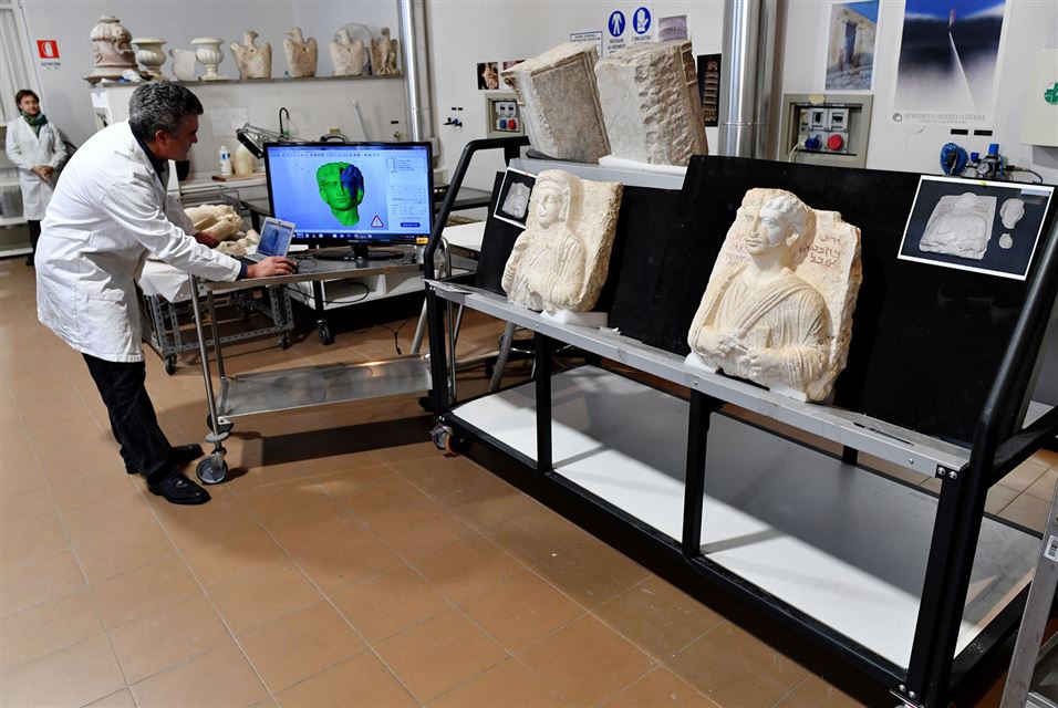 Italian restorer Antonio Iaccarino (L) shows on a computer a 3D model of the two funeral reliefs from Palmyra archeological site that are displayed next to him and that will be restored at the Higher Institute of Conservation and Restoration (ISCR – Istituto Superiore per la Conservazione ed il Restauro) in Rome, on February 16, 2017. The busts of a man and a woman, dated from the 2nd and 3rd century AD and destroyed by the Islamic State group (IS), have been entrusted to the care of the technical and restorers of the ISCR in Rome. By the end of this month, they will be returned to their place of origin. Alberto PIZZOLI / AFP
