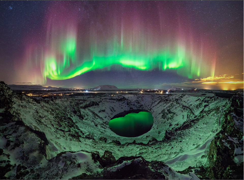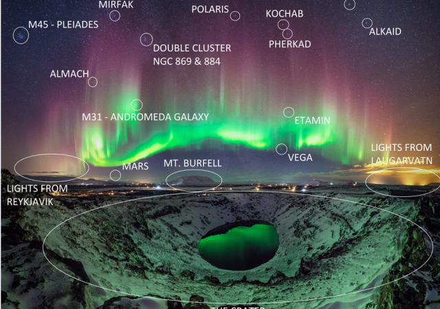 Explanation: You don’t always see a scene this beautiful when you hike to an ancient volcano — you have to be lucky. When the astrophotographer realized that auroras were visible two-weeks ago, he made a night-time run for the top of the caldera to see if he could capture them also reflected in the central lake. When he arrived, he found that … the northern lights were even brighter and more impressive than before! And his image of them is the featured 13-frame panoramic mosaic. The crater lake in the center is called Kerid (Icelandic: Kerið) and is about 3,000 years old. The aurora overhead shows impressive colors and banding, with the red colors occurring higher in the Earth’s atmosphere than the green.