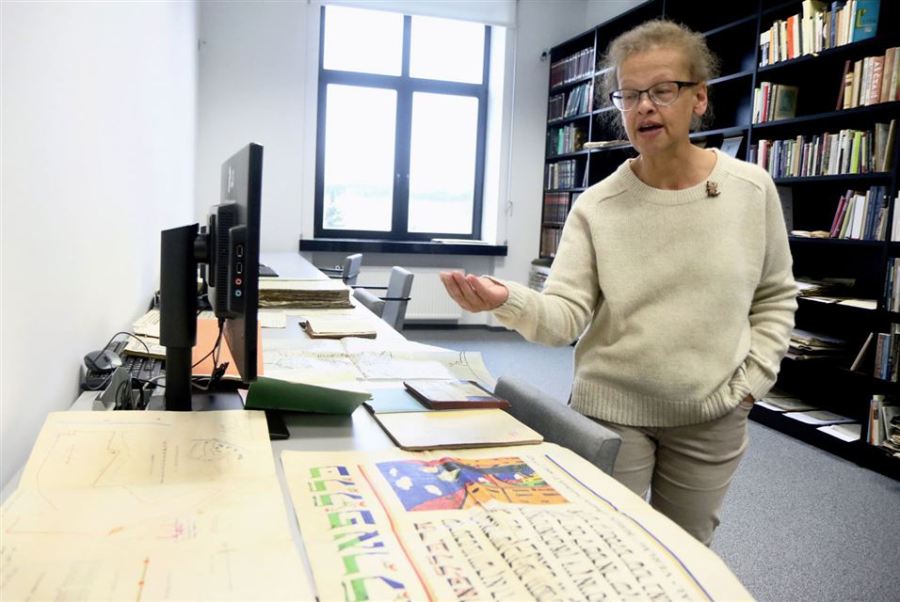 Judaica Research Centre chief Lara Lempertiene shows a map and an advertising poster