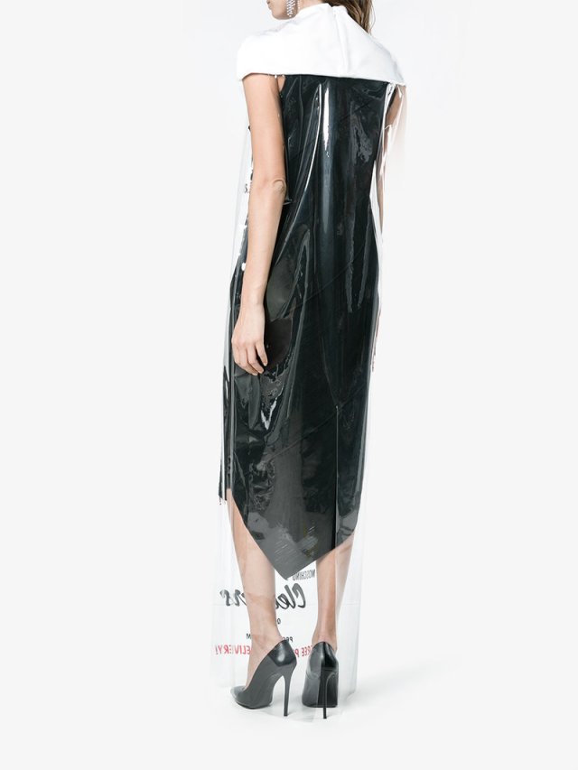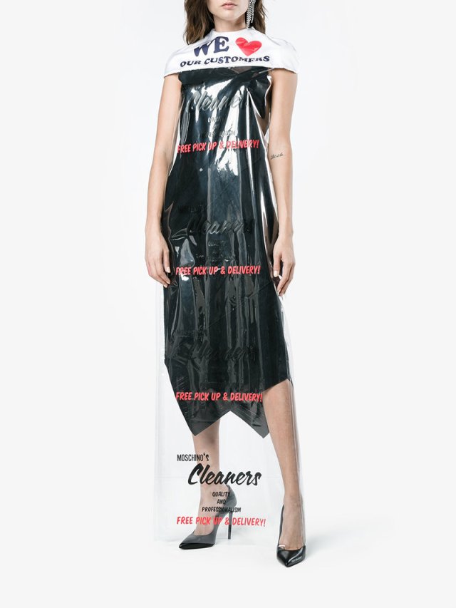 The Moschino “dry cleaning cape overlay dress” by Jeremy Scott is a bargain at $735.00!