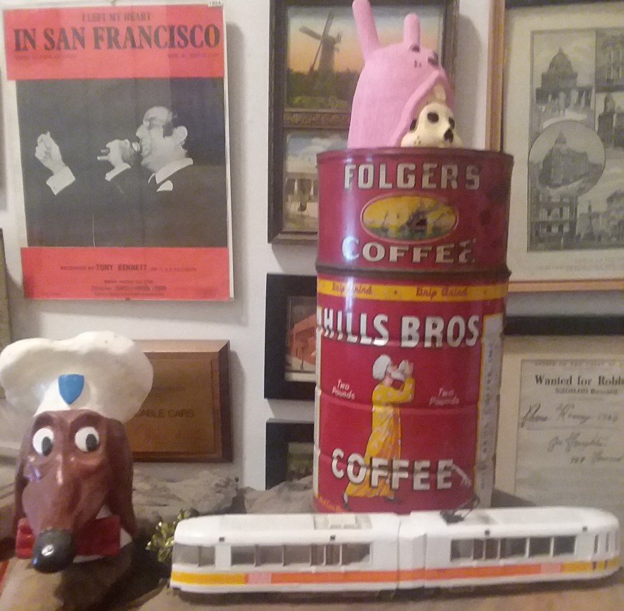 1st edition “I Left My Heart in San Francisco” sheet music:Silly Pink Bunny bobble head:Folger’s and Hills Bros coffees:HO-scale MUNI Boeing street car:Doggie Diner head