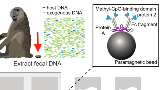 On 31 January 2018, Kenneth Chiou and Christina Bergey published a paper in the journal Scientific Reports describing a method for sampling the genome of an animal population via feces: We have developed a method that makes noninvasive population genomics economically and practically feasible for the first time, by exploiting natural, evolutionarily ancient differences in CpG-methylation densities between vertebrate and bacterial genomes to enrich the host genome from feces.That paper, titled “Methylation-based enrichment facilitates low-cost, noninvasive genomic scale sequencing of populations from feces,” included a detailed diagram of the methodological process for sampling the feces (indicated with red arrow):