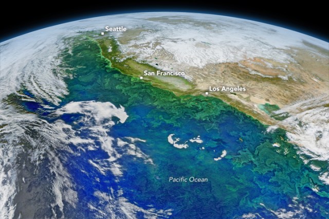 On February 8, 2016, the Visible Infrared Imaging Radiometer Suite (VIIRS) on the Suomi NPP satellite captured several images of blooming phytoplankton and swirling currents along the coast of California and western Mexico.