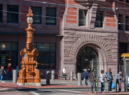 At the left edge, the 1889 De Young Building survives, or at least its restored façade does, and also the historic Lotta’s Fountain, both seen in this photo taken on March 1, 2015.